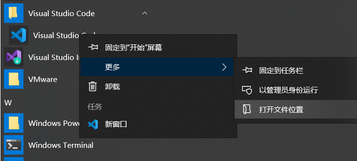 1.开始菜单——Visual Studio Code——右键——更多——打开文件位置;